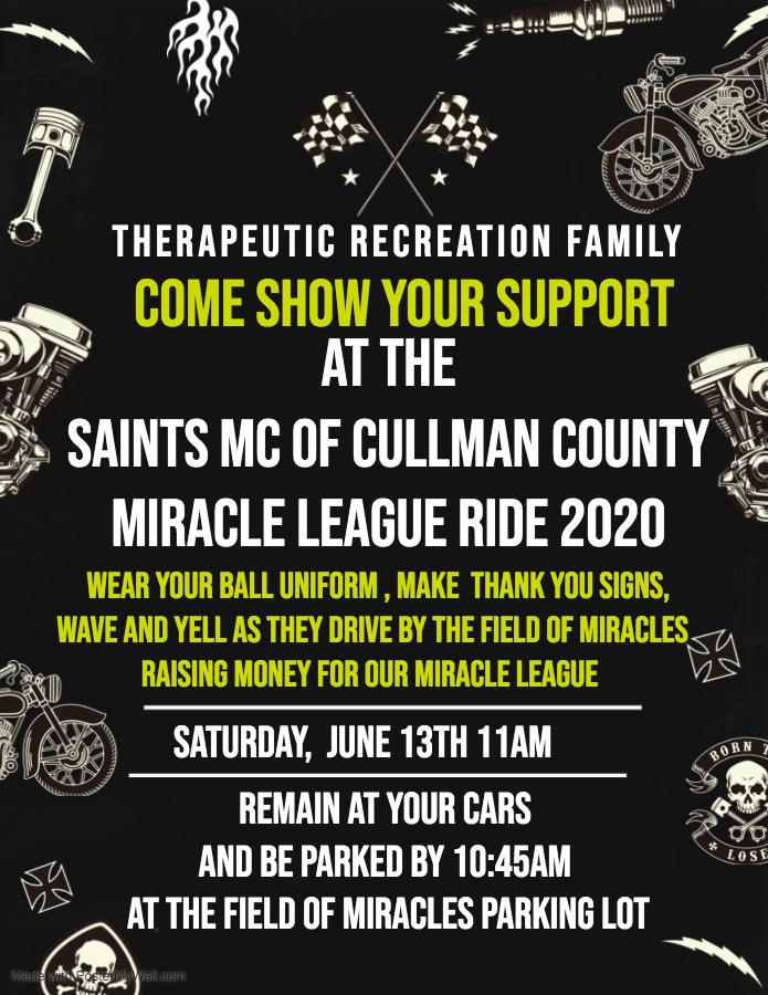 CULLMAN, Ala. – Cullman’s Miracle League for special needs athletes will get a visit at the Field of Miracles Saturday, June 13 from the Saints Motorcycle Club of Cullman County as the club takes a fundraising ride through the area. The club will leave from the Cullman Elks Lodge around 11 a.m. and will pass by the Field of Miracles before heading out of town.
