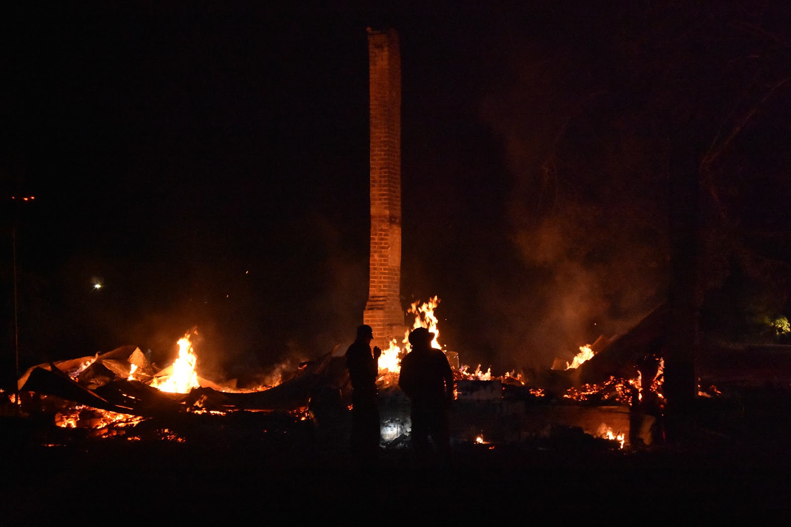Firefighters inspect the burning remains of an abandoned downtown Hanceville house early Tuesday morning. (W.C. Mann for The Cullman Tribune)