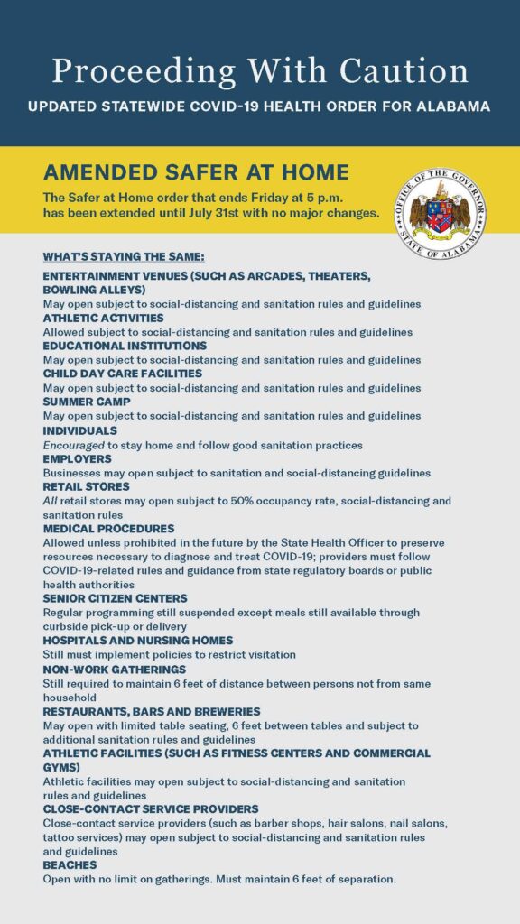 MONTGOMERY, Ala. – Gov. Kay Ivey on Tuesday extended Alabama’s Safer at Home Order, which was set to expire July 3, through July 31. No major changes were made to the order. As the number of cases of COVID-19 continue to increase in Alabama and several other states, some states and counties have made face coverings mandatory; however, Ivey did not make them mandatory for Alabama.