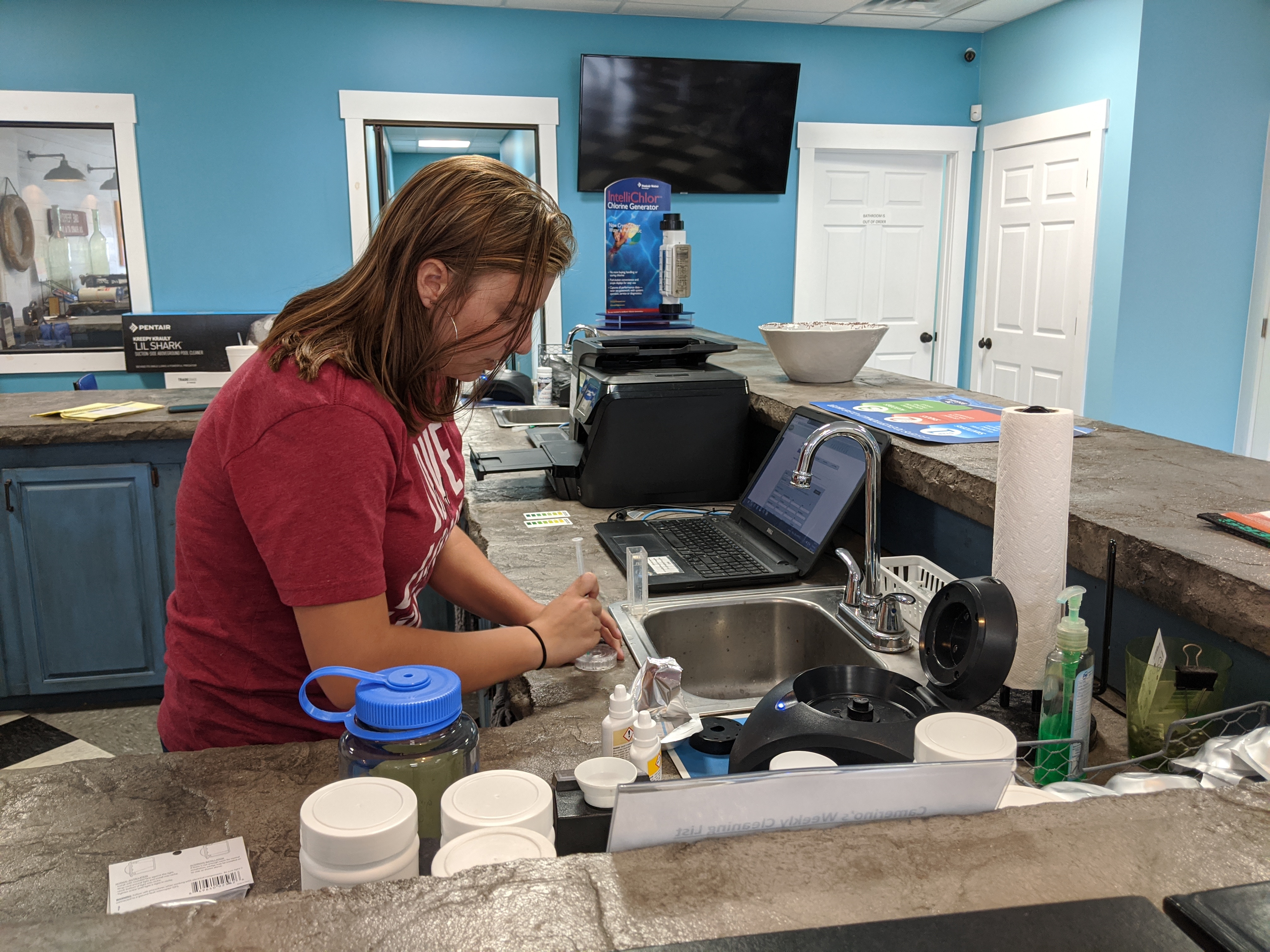 A Burks Brothers Pools & Spas employee performs a test on a water sample. (Heather Mann for The Cullman Tribune)
