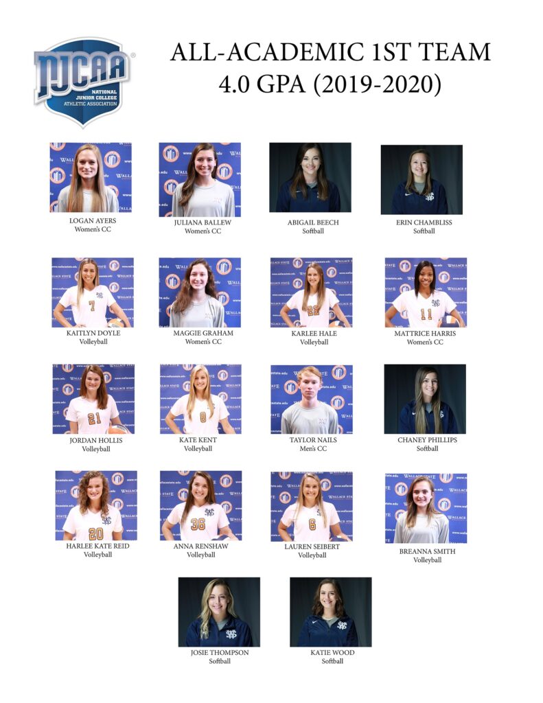 Wallace State had 41 student-athletes earn NJCAA All-Academic recognition, including 18 on the NJCAA All-Academic 1st-Team with a 4.0 GPA. Volleyball had eight players to make the 1st team and softball had five.
