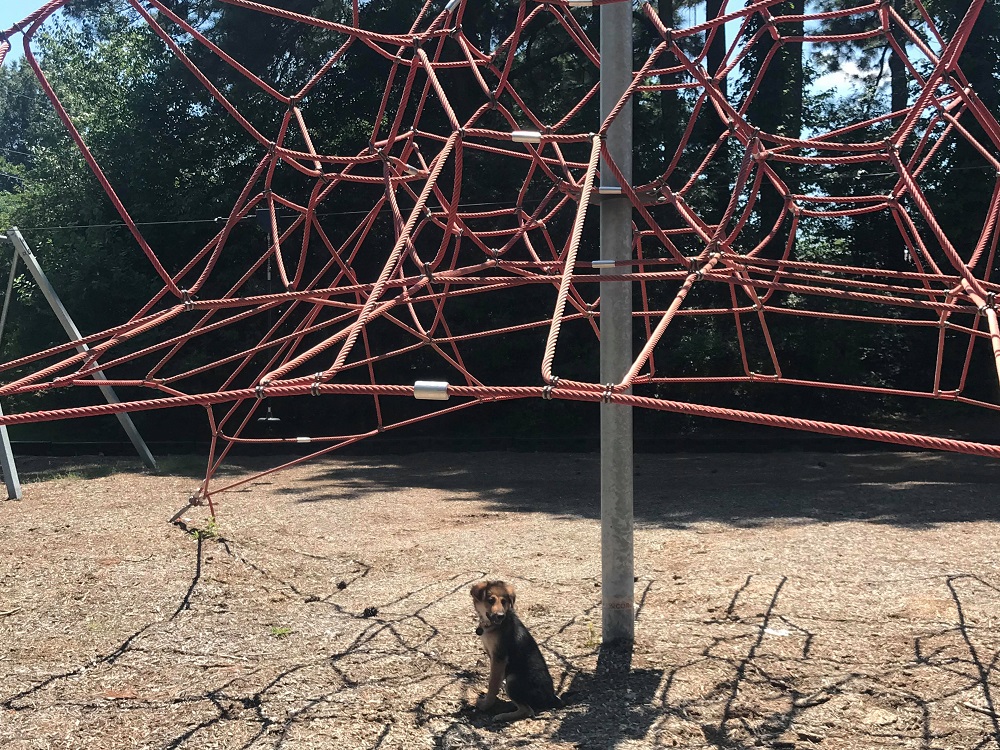 The most noticeable feature of Carroll Acres Park is the giant red rope climbing structure. Although the sign indicates that the playground is designed for 5-12-year-olds, the tall climb proved to be an irresistible challenge for the 18-year-old kid there with his dog. Next to the sprawling climbing feature is a set of four swings for those who prefer to stay closer to the ground.