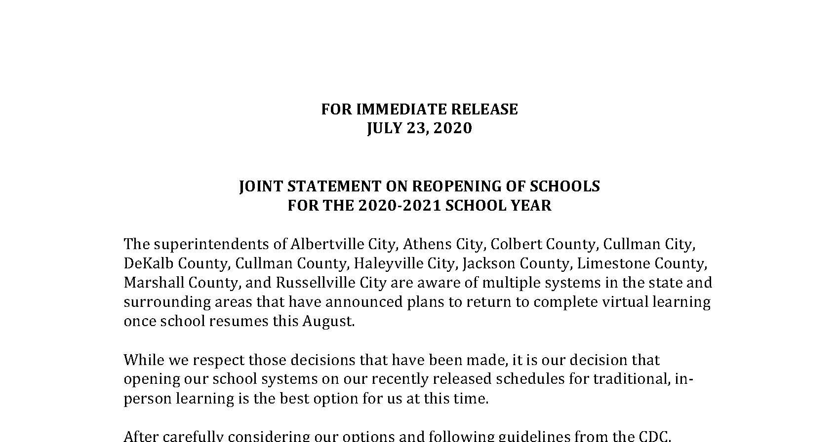 The superintendents of Albertville City, Athens City, Colbert County, Cullman City, DeKalb County, Cullman County, Haleyville City, Jackson County, Limestone County, Marshall County, and Russellville City are aware of multiple systems in the state and surrounding areas that have announced plans to return to complete virtual learning once school resumes this August.