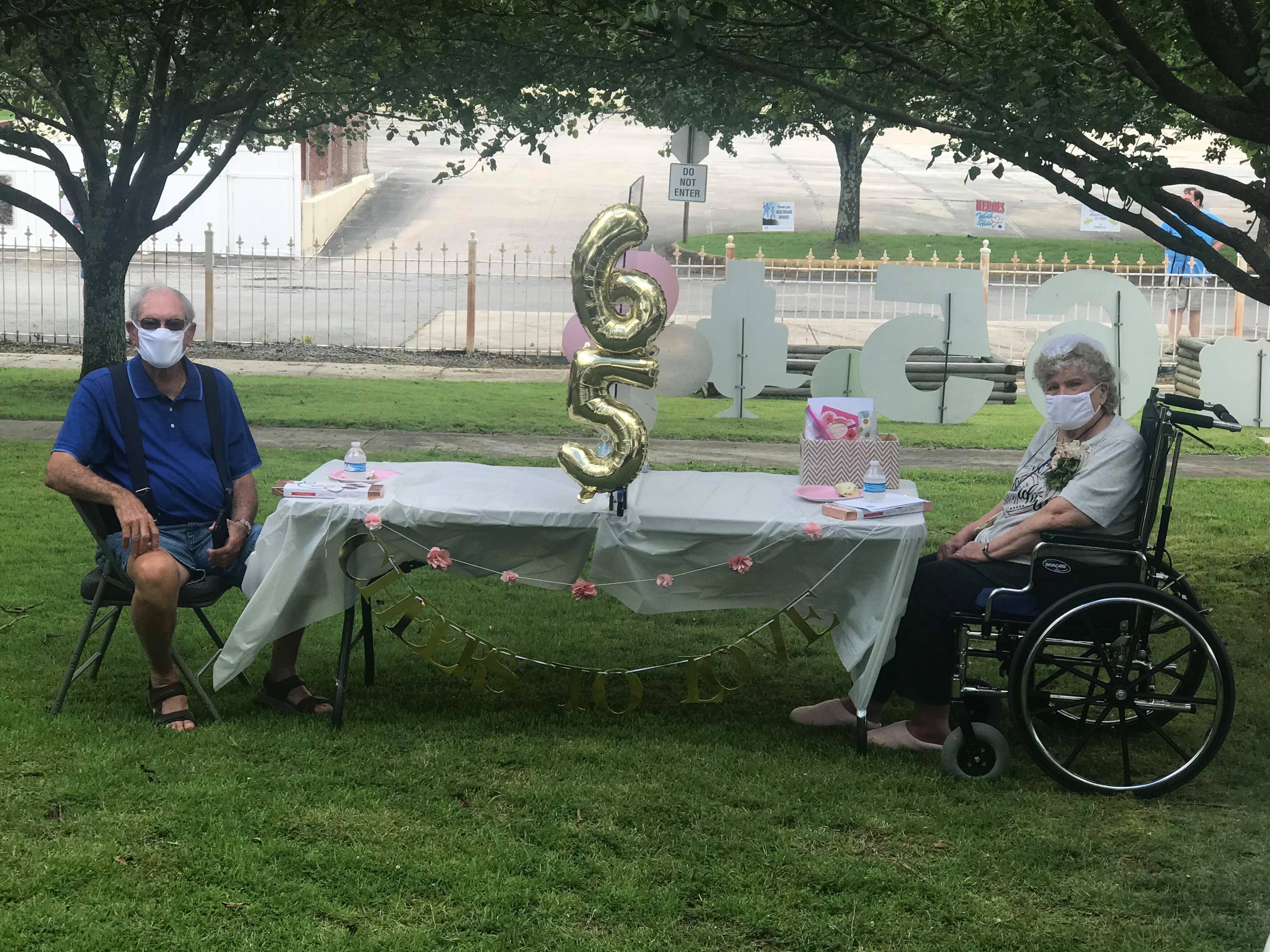 John Lamar Brindley and Jerry Brindley were married July 31, 1955, and Saturday they celebrated 65 years of marriage. Although COVID-19 attempted to intervene, some creative thinking by their family and the staff at The Folsom Center enabled the two love birds to celebrate together, from an appropriate distance, at a table set for two in the garden area of the long-term living facility.