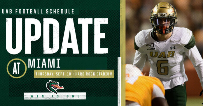 BIRMINGHAM, Ala. – The UAB football game at Miami, which was originally scheduled for September 17, has been changed to Thursday, September 10, the two universities announced Thursday.