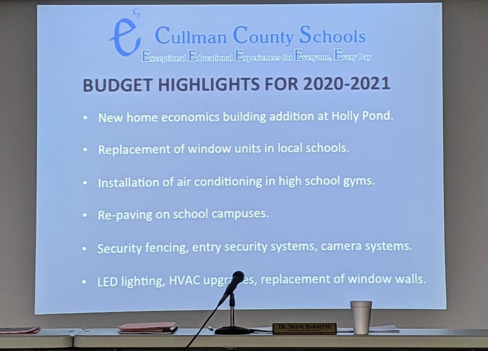 CULLMAN, Ala. – The Cullman County Board of Education (CCBOE) at its monthly meeting Thursday evening passed a $104,020,602.84 budget for fiscal year 2021, an increase of almost $1 million over its $103,065,916.39 budget from 2020. Additional fund uses bring total expenditures to $106,884,309.47. The budget was built on an anticipated $104,177,410.29 in revenues, with additional financing sources that bring total funding to $107,594,716.46.