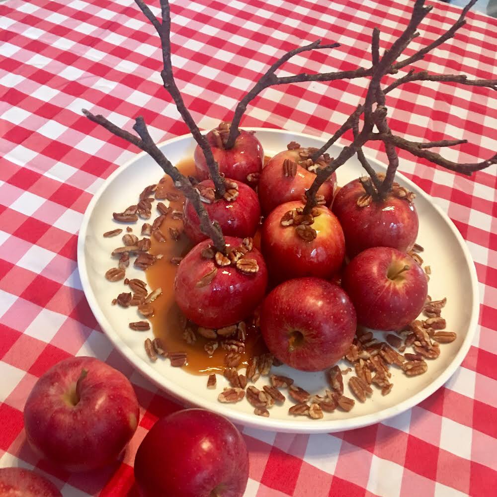 - Dip the apples in the caramel, covering entire surface. Allow excess to drip back in pan. Place on lined sheet tray to harden for at least one hour. Sprinkle or roll apples in the pecans.
