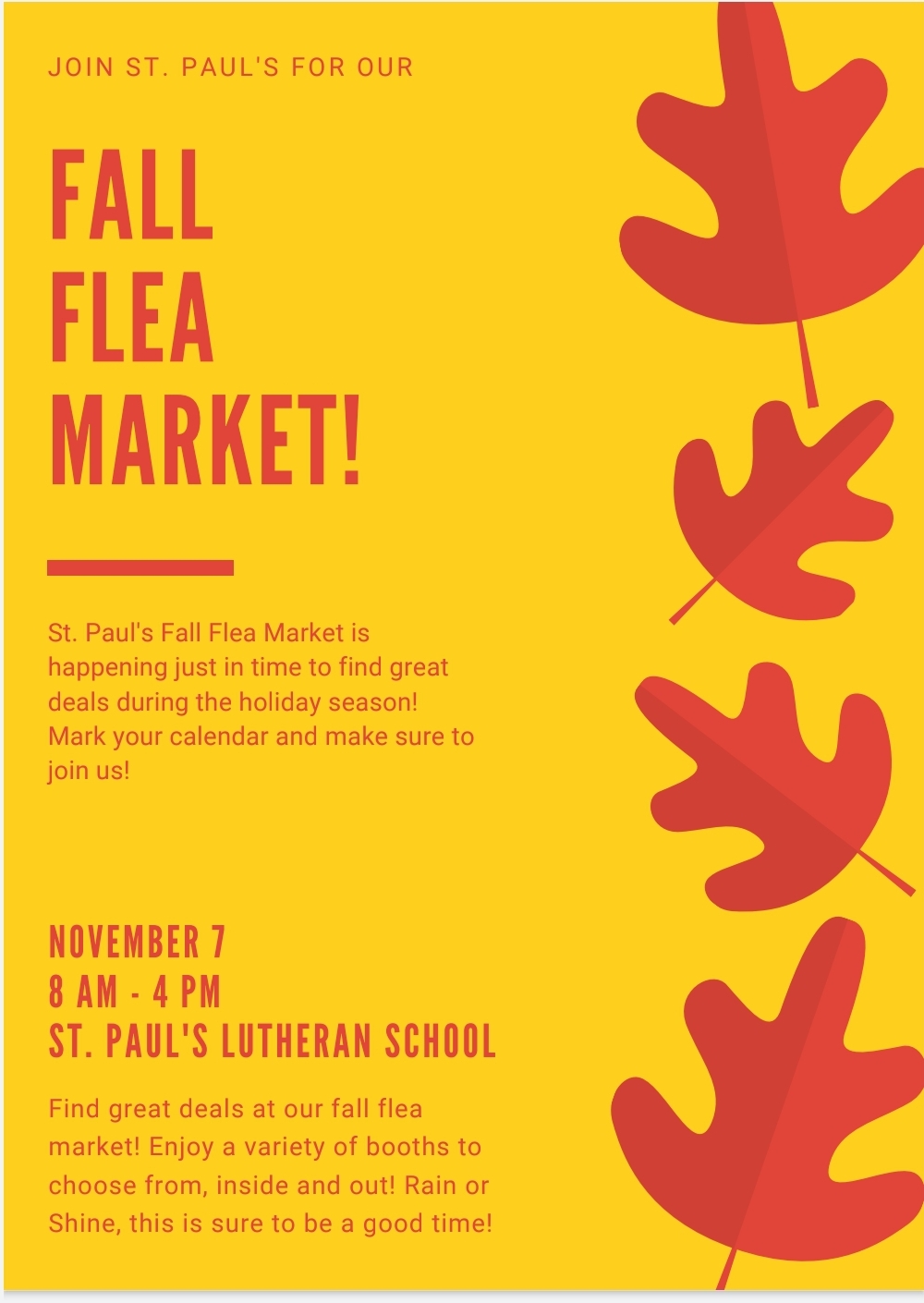 Forty vendor spots are available: $15 for space outside or $30 for a space inside the gym with an option to set up the night before. Spaces are going quickly. If you or your business is interested in renting a booth for the Fall Flea Market, please contact Emily Trahan at emilytrahan@stpaulscullman.com.