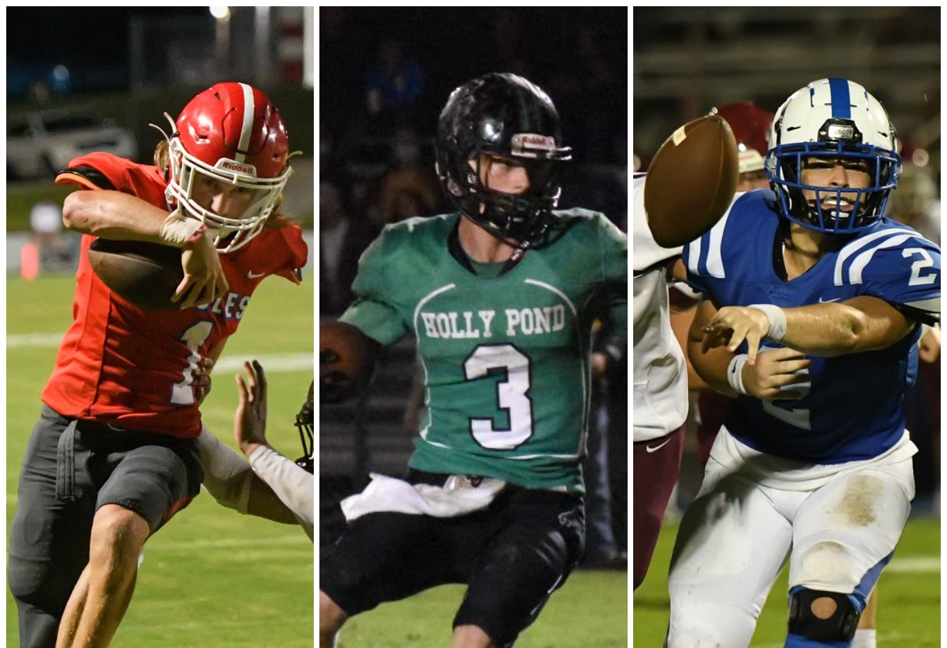 Vinemont’s Colby Miller, Holly Pond’s Landon Perkins and Arab’s Alex Alcala. (Martha Needham and Andrew Knedlik/The Cullman Tribune)