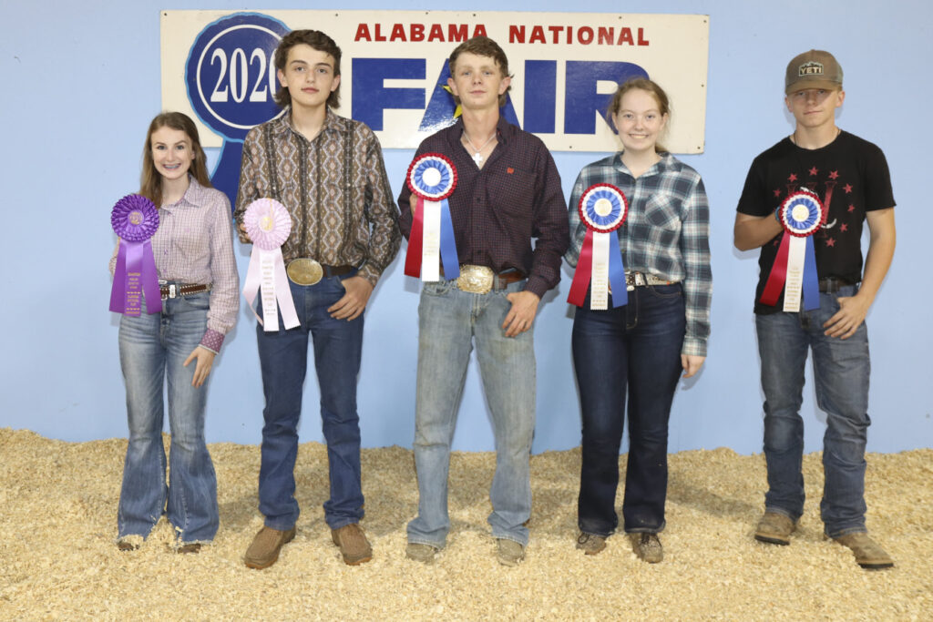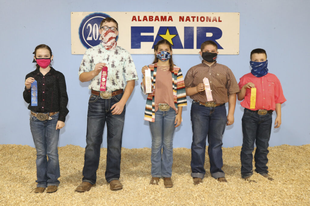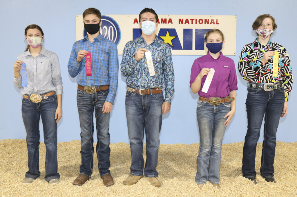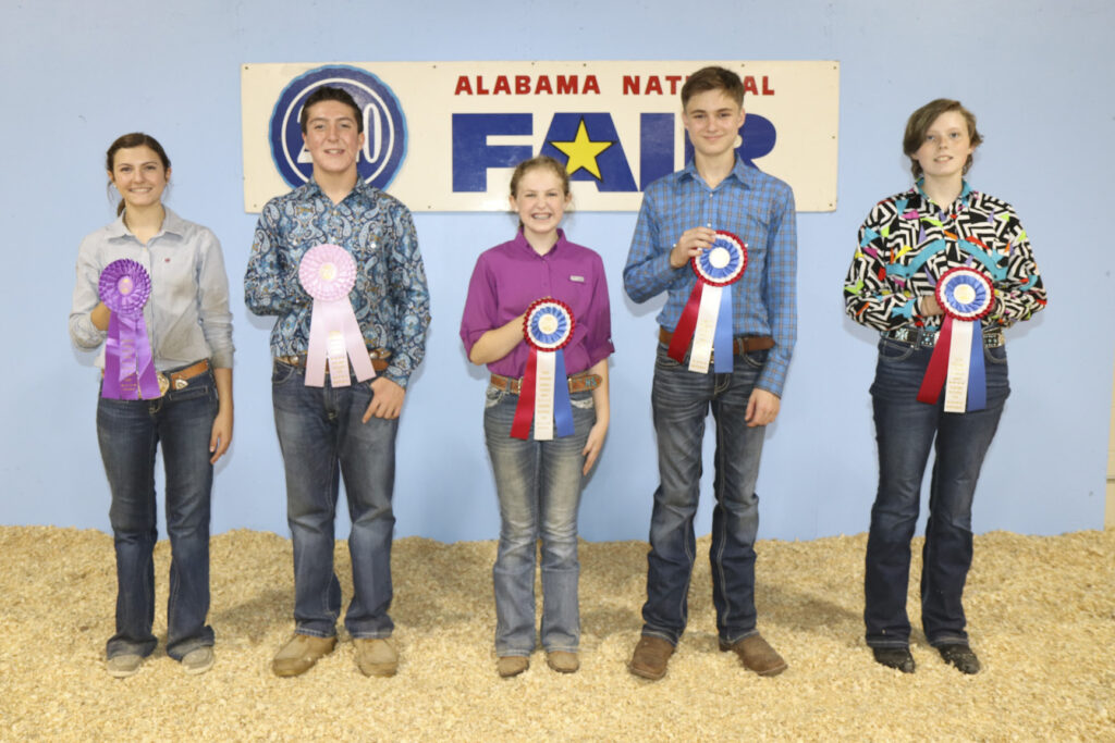 Junior Showmanship Contest winners at the Sheep Show Oct. 9 were, from left, Ella Alldredge of Blount County, first; Miles Williamson of Cleburne County, second; Riley Stephens of Talladega County, third; Mason Smith of Blount County, fourth; and Braxton Gambrill of Cullman County, fifth. The contest was held during the Alabama National Fair and was sponsored by the Alabama Farmers Federation and Alfa Insurance.