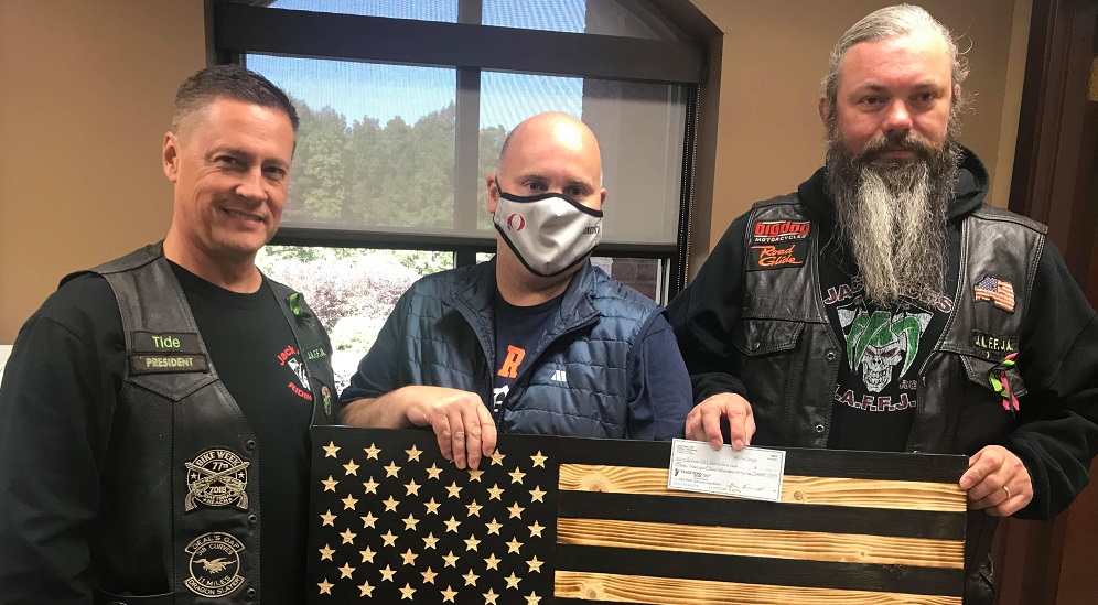 Cullman Police Sgt. Adam Clark accepted the check on behalf of the program and presented Jack Aces President Derrick Barton and Jamie Carpenter a wooden Thin Blue Line flag handcrafted by Officer Brian Medlock.