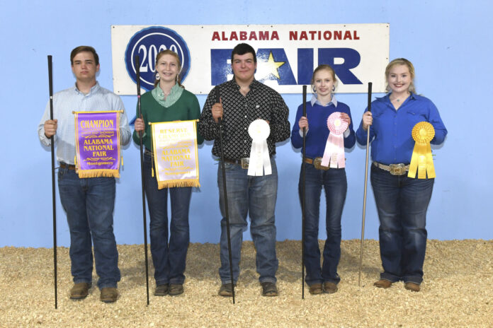 Senior Showmanship winners during the Youth Beef Show were, from left, Trace Strock of Autauga County, first; Jewel Thompson of Lee County, second; Walker Johnson of Cullman County, third; Victoria Thompson of Lee County, fourth; and Hannah Grace Childress, Chilton County, fifth. The show was held Oct. 17 during the Alabama National Fair in Montgomery. Show sponsors are the Alabama Farmers Federation and Alfa Insurance.