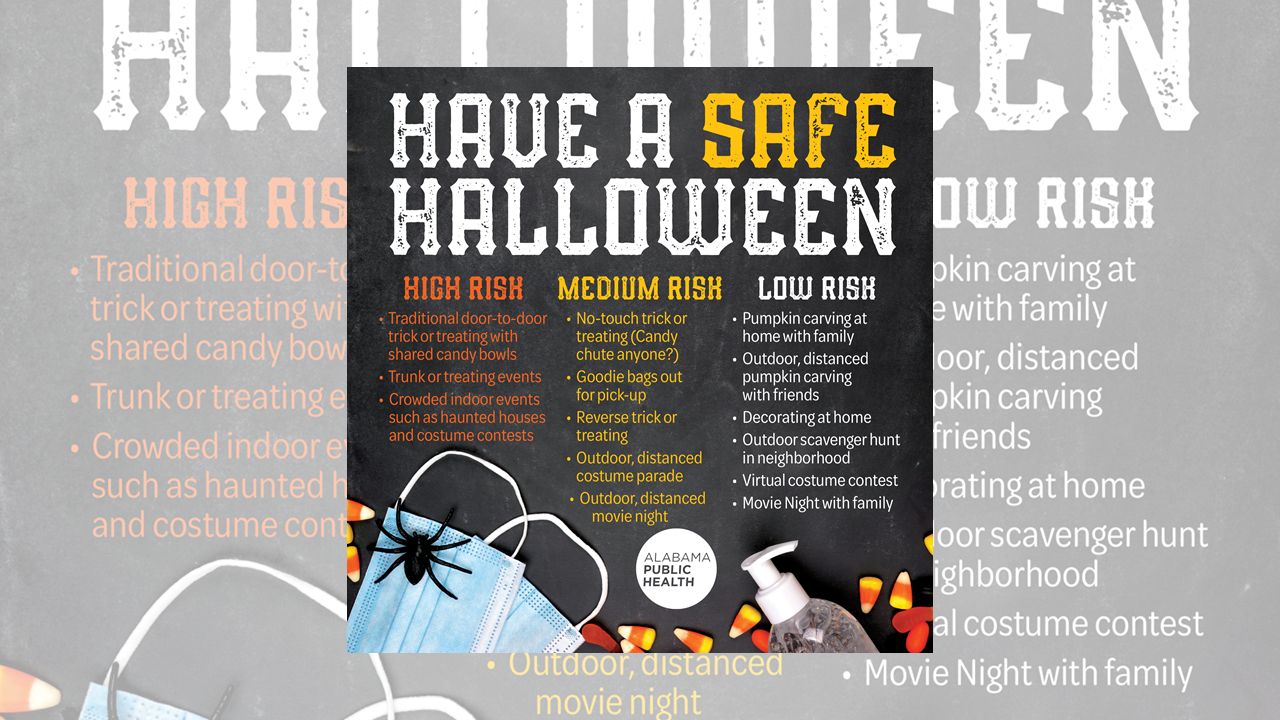MONTGOMERY, Ala. – Protecting families, friends and communities from contracting and spreading the novel coronavirus COVID-19 is a major concern for Alabama families in 2020. Consistent with Centers for Disease Control and Prevention recommendations, the Alabama Department of Public Health (ADPH) encourages families to find safer, alternative activities to traditional door-to-door trick-or-treating this Halloween.