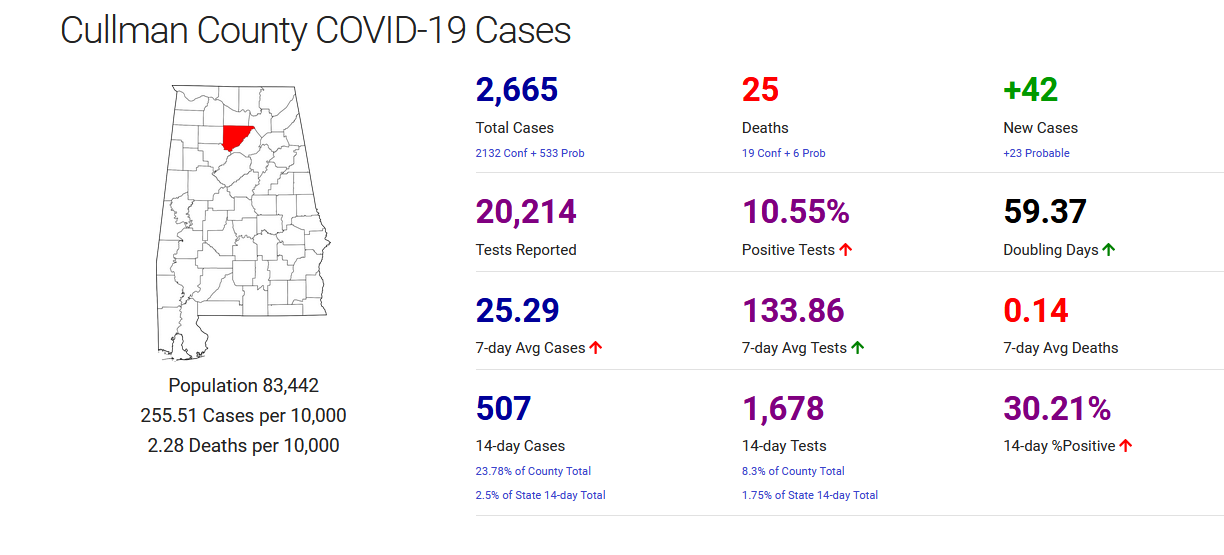 Total confirmed cases in Cullman Co.: 2,132 (+42 since yesterday)
