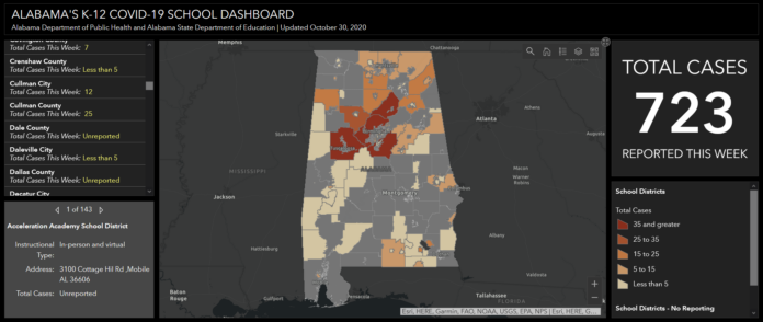 MONTGOMERY, Ala. – The Alabama Department of Health (ADPH) and Alabama State Department of Education (ALSDE) on Friday launched the Alabama K-12 COVID-19 School Dashboard (https://bit.ly/31Z4uhd). Cases will be self-reported by Alabama’s public school districts on a weekly basis.