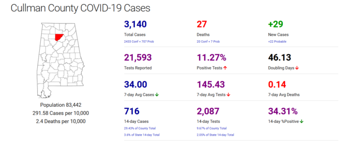 CULLMAN, Ala. – Cullman County added 29 confirmed cases of COVID-19 in the last 24 hours, according to the Alabama Department of Public Health, with 2,433 cases confirmed across the county since the beginning of the pandemic. Of those, 716 were confirmed in just the last 14 days.