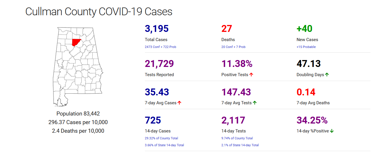 CULLMAN, Ala. – Cullman County added 40 confirmed cases of COVID-19 in the last 24 hours, according to the Alabama Department of Public Health, with 2,473 cases confirmed across the county since the beginning of the pandemic. Of those, 725 were confirmed in just the last 14 days.