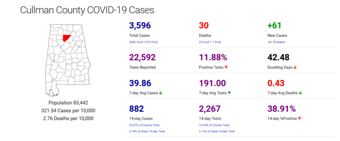 CULLMAN, Ala. – Cullman County added 61 confirmed cases of COVID-19 in the last 24 hours, according to the Alabama Department of Public Health, with 2,683 cases confirmed across the county since the beginning of the pandemic. Of those, 882 were confirmed in just the last 14 days.