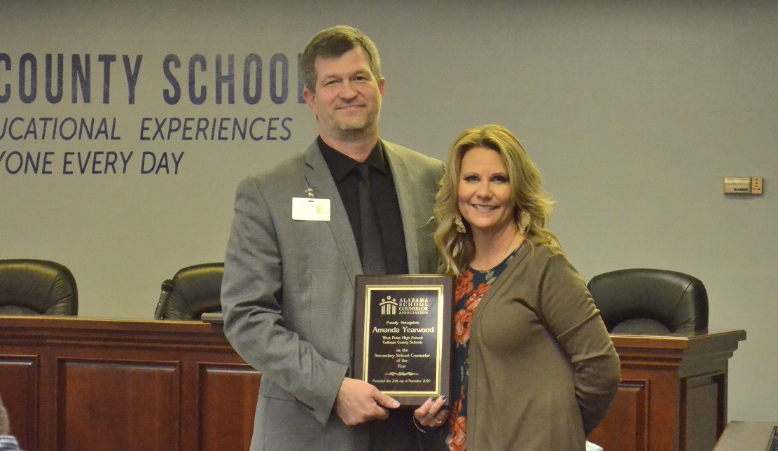 CULLMAN, Ala. – The Cullman County Board of Education (CCBOE) held its monthly work session and board meeting Tuesday afternoon and after a lengthy discussion about potential maintenance projects in the work session, in its meeting the board recognized West Point High School Counselor Amanda Yearwood, the recipient of this year’s Alabama School Counselor Association Secondary School Counselor of the Year Award.
