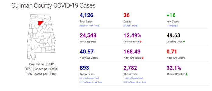 Total confirmed cases in Cullman Co.: 3,065 (+16 since yesterday)
