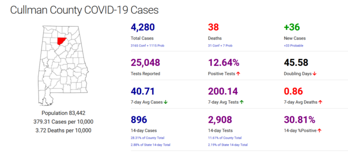 CULLMAN, Ala. – According to the Alabama Department of Public Health (ADPH), Cullman County added 36 new cases of COVID-19 in the last 24 hours, with 3,165 cases confirmed across the county since the beginning of the pandemic. Of those, 896 were confirmed in just the last 14 days.