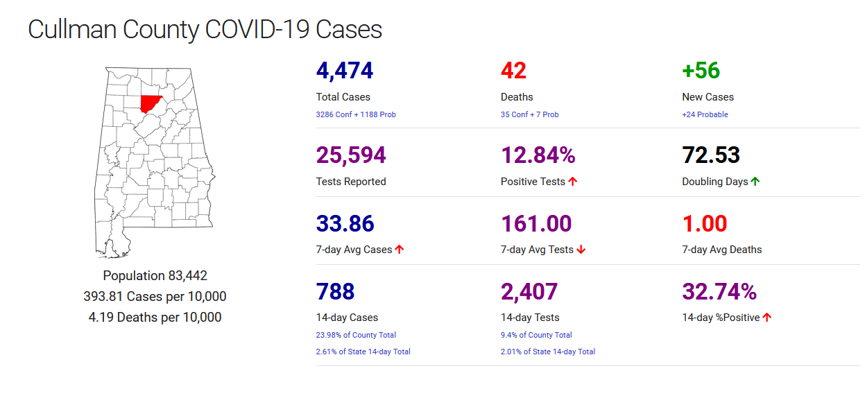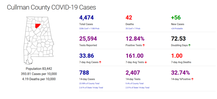CULLMAN, Ala. –  According to the Alabama Department of Public Health (ADPH), Cullman County added 56 new cases of COVID-19 in the last 24 hours, with 3,286 cases confirmed across the county since the beginning of the pandemic. Of those, 788 were confirmed in just the last 14 days.