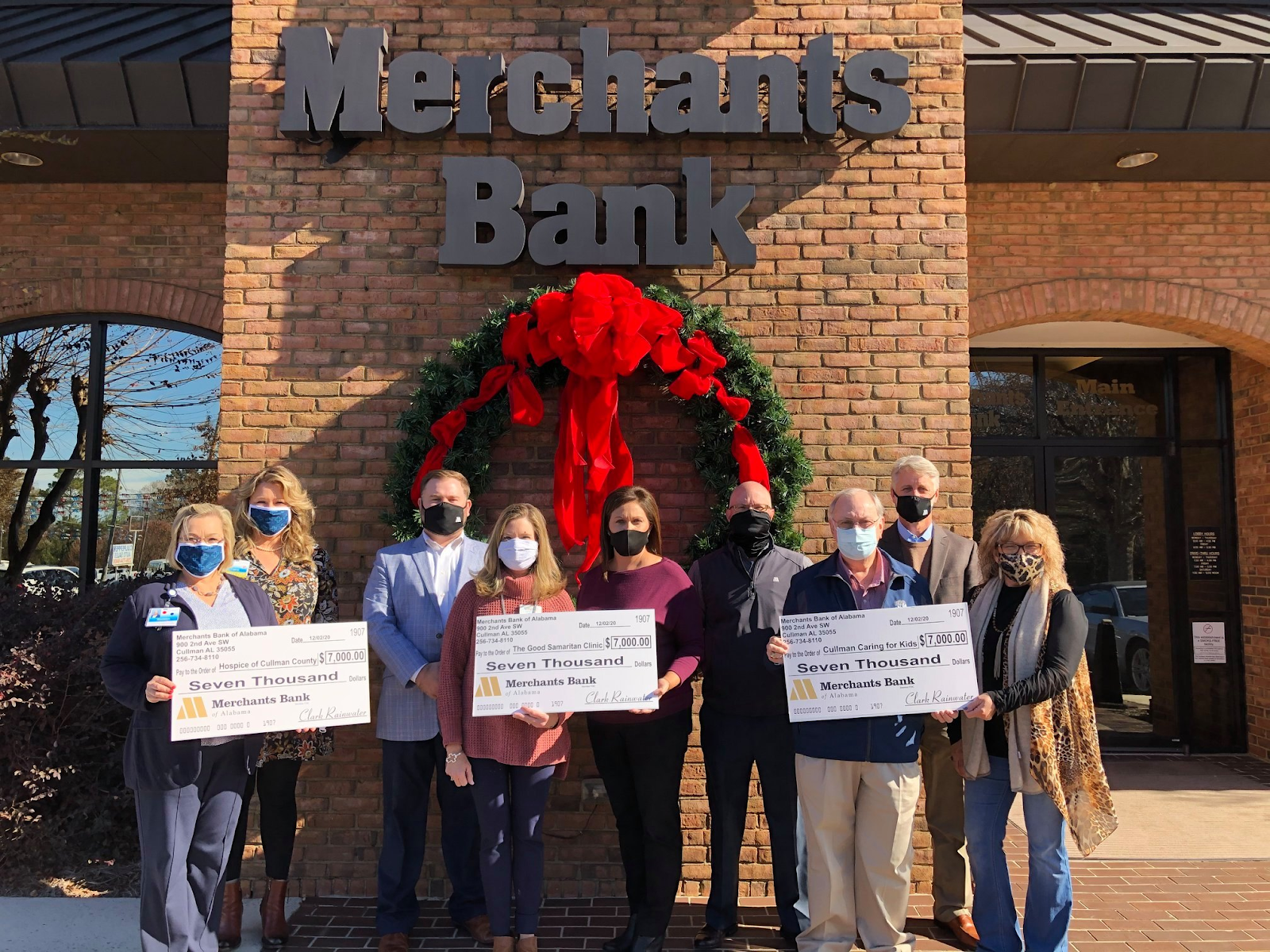 CULLMAN, Ala. – Merchants Bank on Wednesday presented checks totaling $21,000 to three local charities: Cullman Caring for Kids, Good Samaritan Health Clinic and Hospice of Cullman County each received $7,000 from the proceeds of the bank’s 27th annual Merchants Charity Classic Golf Tournament held at Terri Pines Country Club Sept. 28. In addition to the three local charities, a donation will also be made to the Boys and Girls Ranches of Alabama.