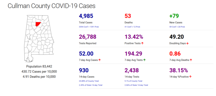 CULLMAN, Ala. – According to the Alabama Department of Public Health (ADPH), Cullman County added 59 new cases of COVID-19 in the last 24 hours, with 3,594 cases confirmed across the county since the beginning of the pandemic. Of those, 930 were confirmed in just the last 14 days. Statewide, the ADPH reported 2,735 new confirmed cases in the last 24 hours, with 37,370 in the last 14 days.
