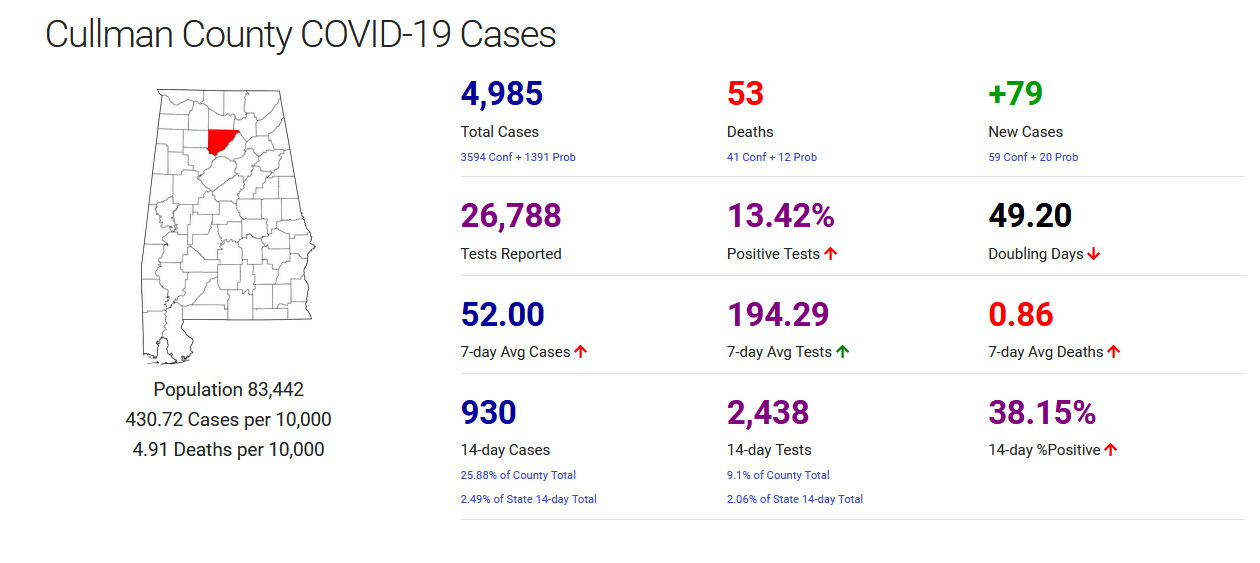 Total confirmed cases in Cullman Co.: 3,594 (+59 since yesterday)