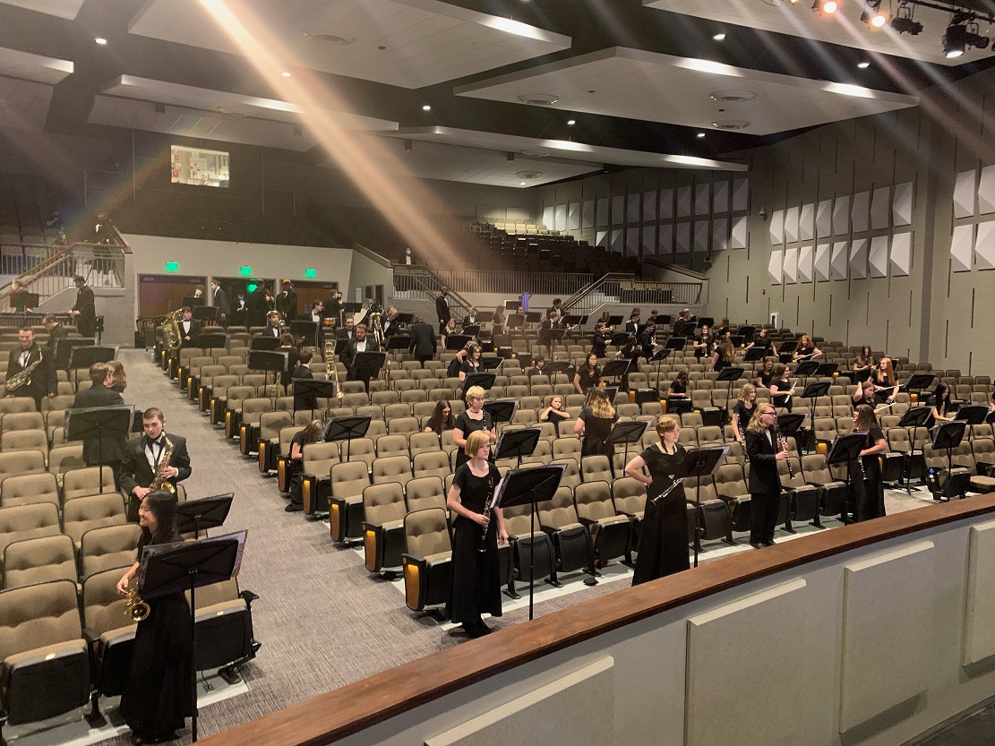 The band had been using the auditorium as a practice space, with students positioned all across the audience seating, one of the only rooms on campus big enough to allow the student band members to properly and safely distance from one another while still rehearsing together. That took care of practice, but what about the holiday concert itself? With the band scattered across the seating area, Fine Arts Department Chair and Director of Bands Christopher Smith said they had to get creative when it came to the audience.