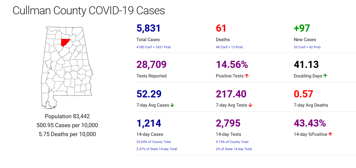 CULLMAN, Ala. – According to the Alabama Department of Public Health (ADPH), Cullman County added 55 new confirmed cases of COVID-19 in the last 24 hours, with 4,180 cases confirmed across the county since the beginning of the pandemic. Of those, 1,214 were confirmed in just the last 14 days. Statewide, the ADPH reported 2,241 new confirmed cases in the last 24 hours, with 49,244 in the last 14 days.