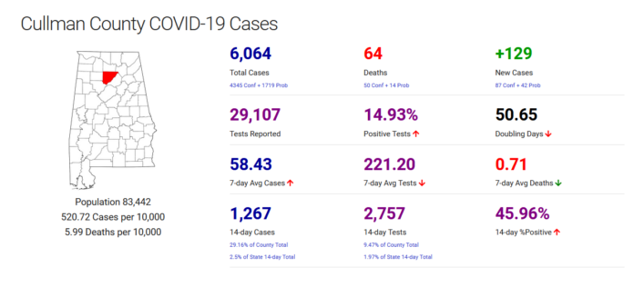 CULLMAN, Ala. – According to the Alabama Department of Public Health (ADPH), Cullman County added 87 new confirmed cases of COVID-19 in the last 24 hours, with 4,345 cases confirmed across the county since the beginning of the pandemic. Of those, 1,267 were confirmed in just the last 14 days. Statewide, the ADPH reported 3,515 new confirmed cases in the last 24 hours, with 50,687 in the last 14 days.
