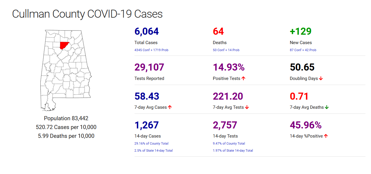 Total confirmed cases in Cullman Co.: 4,345 (+87 since yesterday)