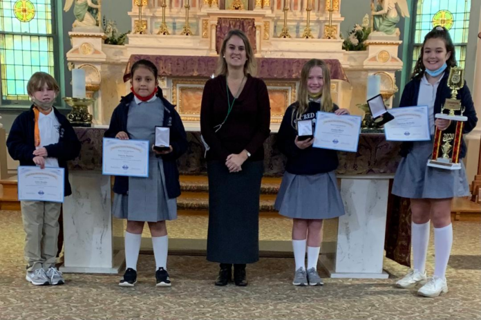 Sacred Heart local and state 2019-2020 Zaner-Bloser handwriting winners: (left to right) John Carl Knight (Kindergarten -classroom winner), Valeria Becerra (first grade-state winner), Shawna Norman (principal), Jordyn Black (third grade-state winner) and Caroline McBride (fifth grade-state and grand national champion). Not pictured: state winners Maria Agnello (fourth grade) and Charli Roberson (sixth grade). (Photo courtesy of Shawna Norman)