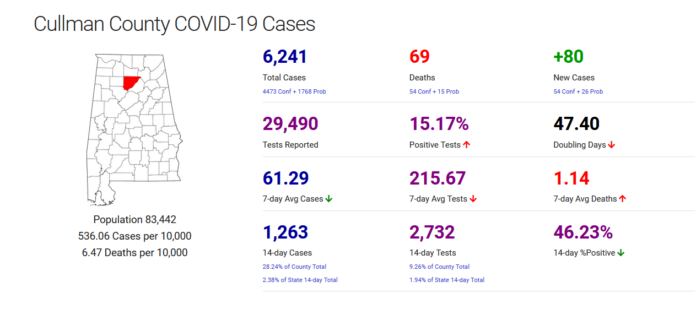 CULLMAN, Ala. –  According to the Alabama Department of Public Health (ADPH), Cullman County added 54 new confirmed cases of COVID-19 in the last 24 hours, with 4,473 cases confirmed across the county since the beginning of the pandemic. Of those, 1,263 were confirmed in just the last 14 days. Statewide, the ADPH reported 2,955 new confirmed cases in the last 24 hours, with 53,096 in the last 14 days.