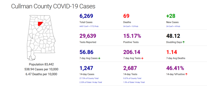 CULLMAN, Ala. – According to the Alabama Department of Public Health (ADPH), Cullman County added 24 new confirmed cases of COVID-19 in the last 24 hours, with 4,497 cases confirmed across the county since the beginning of the pandemic. Of those, 1,247 were confirmed in just the last 14 days. Statewide, the ADPH reported 2,097 new confirmed cases in the last 24 hours, with 53,485 in the last 14 days.