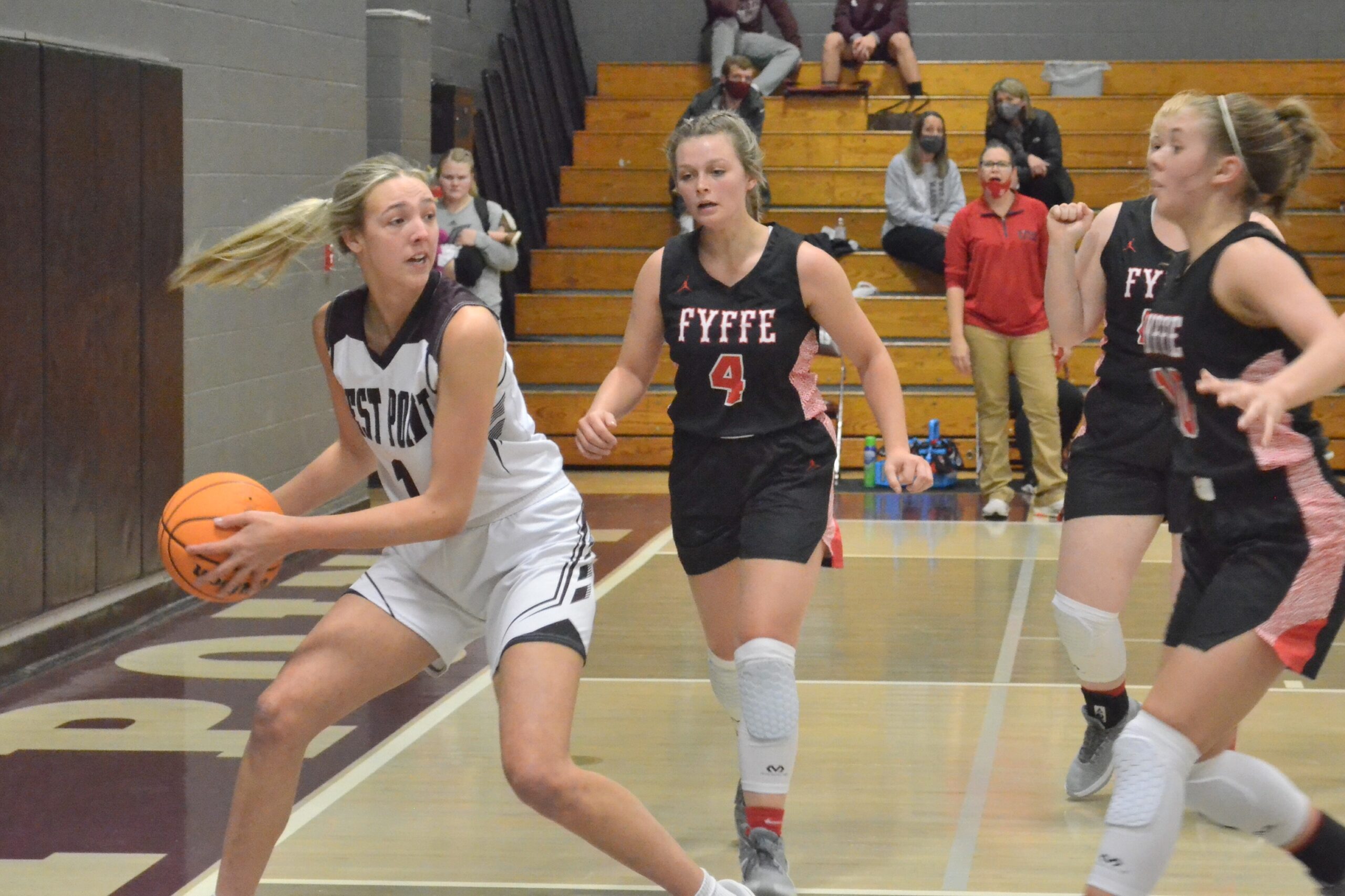 A pair of Lexi Shadix baskets and a score by Braelee Quinn gave West Point an early 6-0 advantage to start the game and a three-pointer from Braelee kept the Lady Warriors in front 9-4 midway through the first quarter. Fyffe began to cut into the lead but another basket by Quinn made it a 12-9 game with just over a minute to play in the period. A Shadix layup stretched the lead to five but the Lady Red Devils buried a three just before the buzzer to trim the lead to 14-12 going into the second quarter.