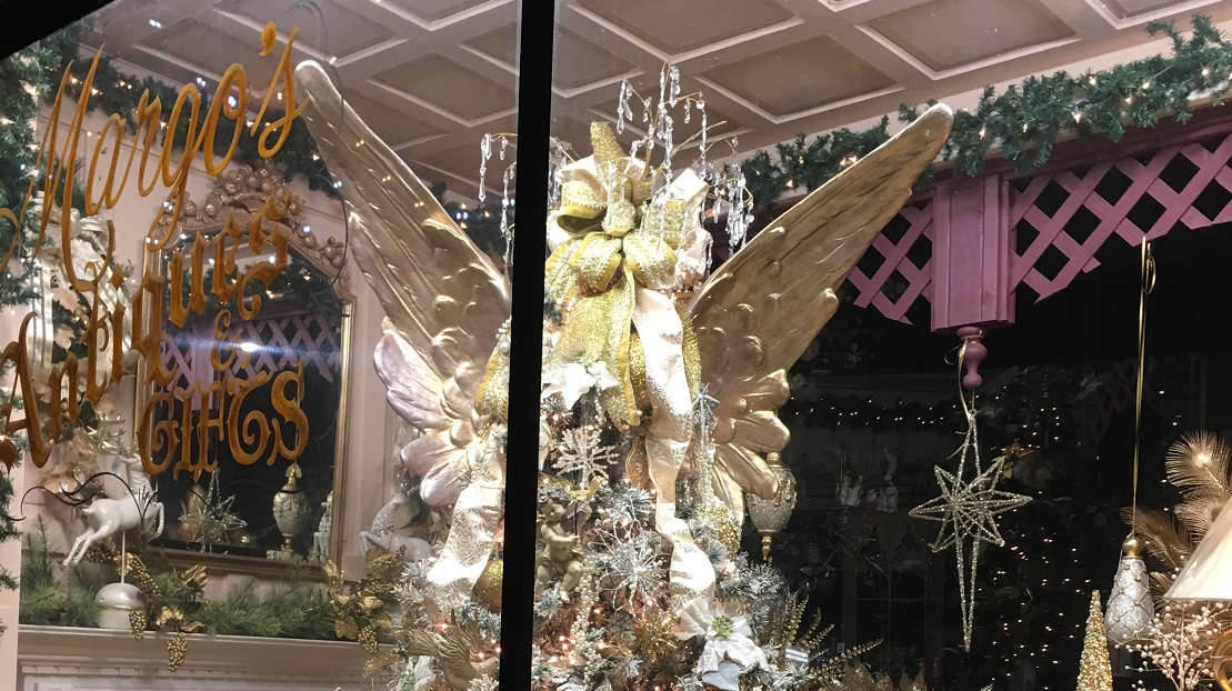 Margo’s is located in what was once part of the Stiefelmeyer department store. The large glass front windows were made for wonderful displays and Margo’s does not disappoint. An exquisite, flocked tree adorned with golden angel wings stops everyone as they enter the store.