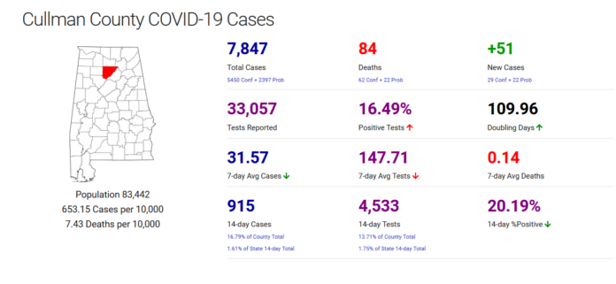 CULLMAN, Ala. – According to the Alabama Department of Public Health (ADPH), Cullman County added 29 new confirmed cases of COVID-19 in the last 24 hours, with 5,450 cases confirmed across the county since the beginning of the pandemic. Of those, 915 were confirmed in the last 14 days. Statewide, the ADPH reported 2,052 new confirmed cases in the last 24 hours, with 56,708 in the last 14 days.
