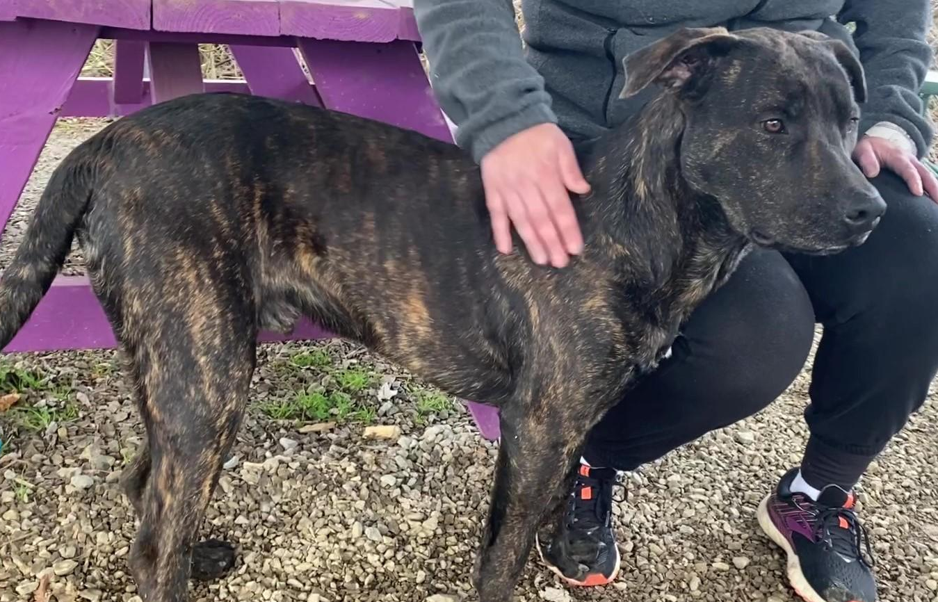 Chevy is a Catahoula-terrier mix who’s a little over 1 year old, a big athletic fellow with beautiful brindle coloration. He’s an active-but-not-hyper, medium-energy pet who is quiet in his kennel, but active and vocal when he gets to play outside. He enjoys outdoor activities and eagerly takes on challenges like the shelter’s obstacle course.