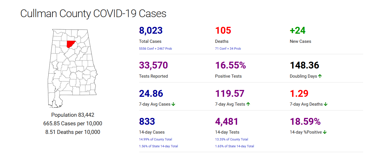 Total confirmed cases in Cullman Co.: 5,556 (+24 since yesterday)