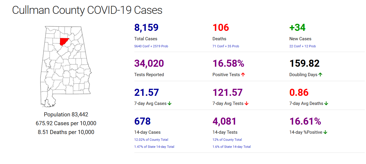 Total confirmed cases in Cullman Co.: 5,640 (+22 since yesterday)