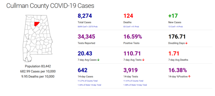 CULLMAN, Ala. – According to the Alabama Department of Public Health (ADPH), Cullman County added 13 new confirmed cases of COVID-19 in the last 24 hours, with 5,699 cases confirmed across the county since the beginning of the pandemic. Statewide, the ADPH reported 1,444 new confirmed cases in the last 24 hours.