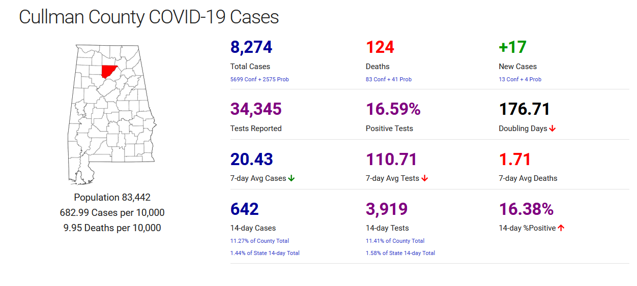 Total confirmed cases in Cullman Co.: 5,699 (+13 since yesterday)