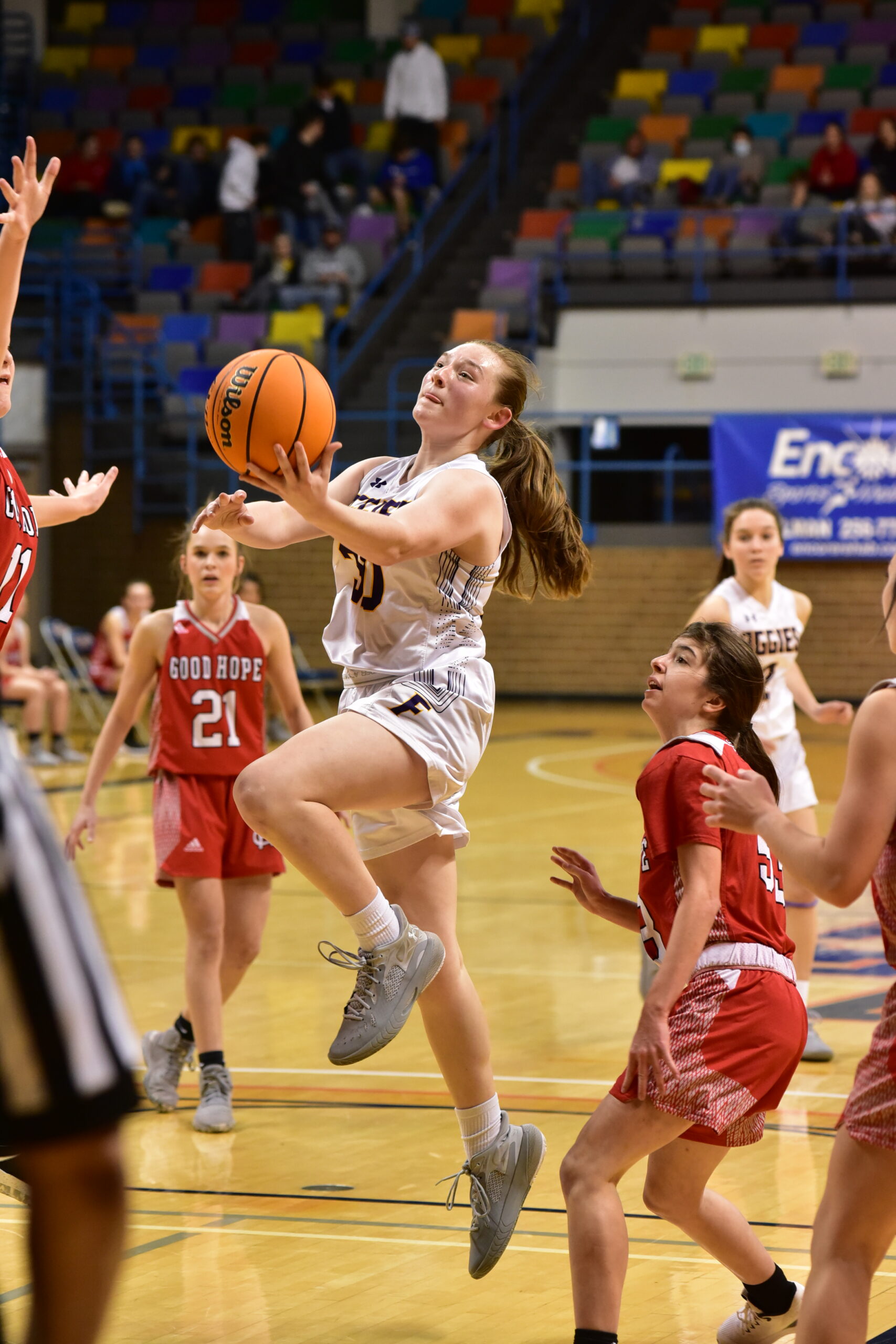HANCEVILLE, Ala. – The varsity girls’ semifinals were on tap at Tom Drake Coliseum Thursday night and we tipped things off with a clash between the top-seeded Fairview Lady Aggies and the fourth-seeded Lady Raiders of Good Hope. Fairview applied the pressure on the defensive end all night and after holing the Lady Raiders to just 18 points in the first half, the Lady Aggies pulled away to take the semifinal battle 54-38.