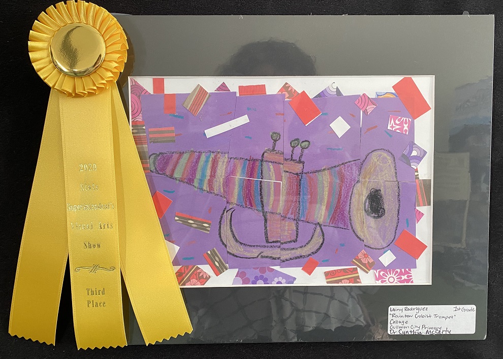Rodriquez won as a first grader. Her piece was a collage entitled “Rainbow Cubist Trumpet.” She was invited and traveled to Montgomery to be recognized by State Superintendent Dr. Eric Mackey.