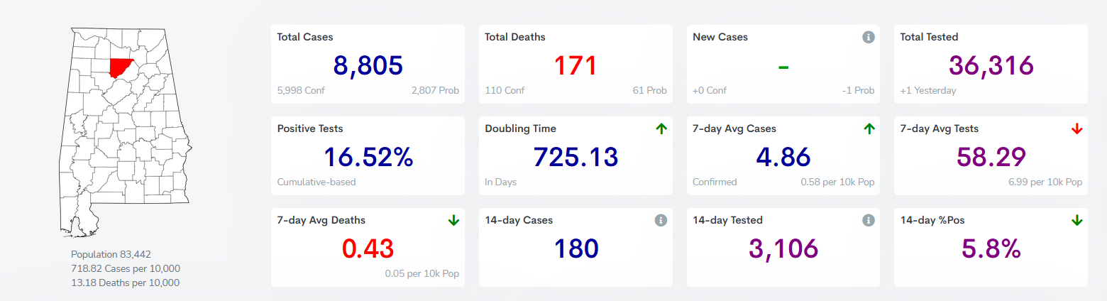 - Total confirmed deaths in Cullman Co.: 110 (+0 since yesterday)