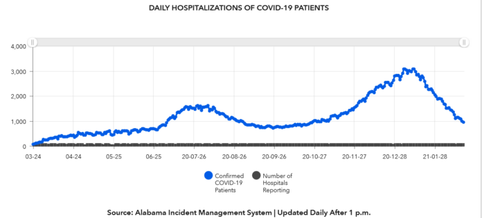 More than 480,000 cases of COVID-19 have been reported in Alabama, and Alabama’s case fatality rate is more than 1.9%. During the past 2 weeks, COVID-19 numbers have trended downward, and hospitalization rates are one-third of what they were a month earlier. Alabama’s percent positivity of 11.3% is its lowest since Nov. 1. Slightly more than 10% of Alabamians have received a first-dose vaccination and about 10% have been infected with COVID-19.
