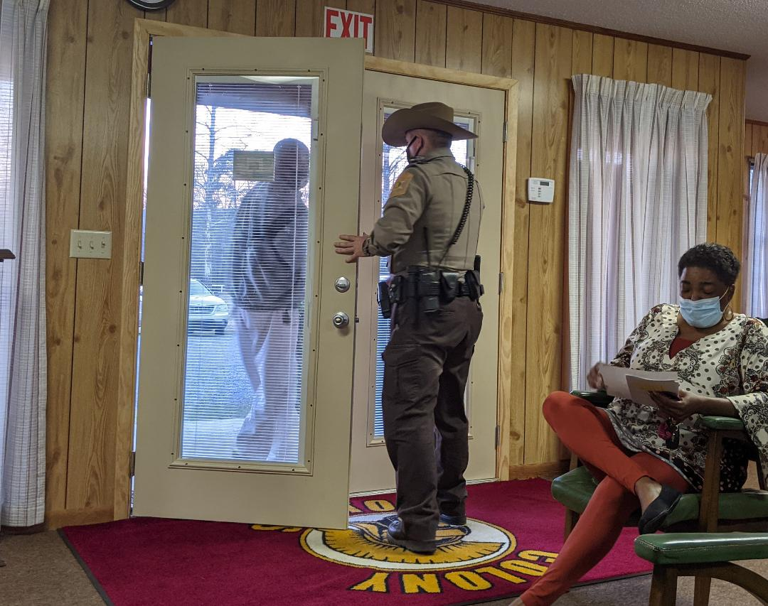 A CCSO deputy closes the Colony Town Hall door behind former Mayor Donnis Leeth after a verbal altercation with current Mayor Curtis Johnson. (W.C. Mann for The Cullman Tribune)