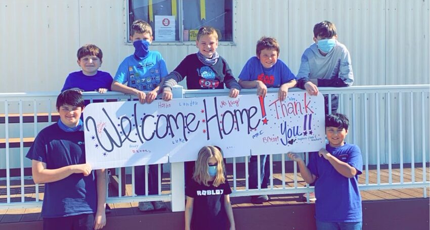 Herron’s father was scheduled to be back in Florida Feb. 26, but Ashley Herron waited until a day or two before his arrival to tell her son. When he did learn his dad would be home soon, he couldn’t wait to tell his class about the good news. Sanderson and the 11 students in his class made a large banner for Herron to take with him to the airport. Each child signed the banner around the “Welcome Home” message.